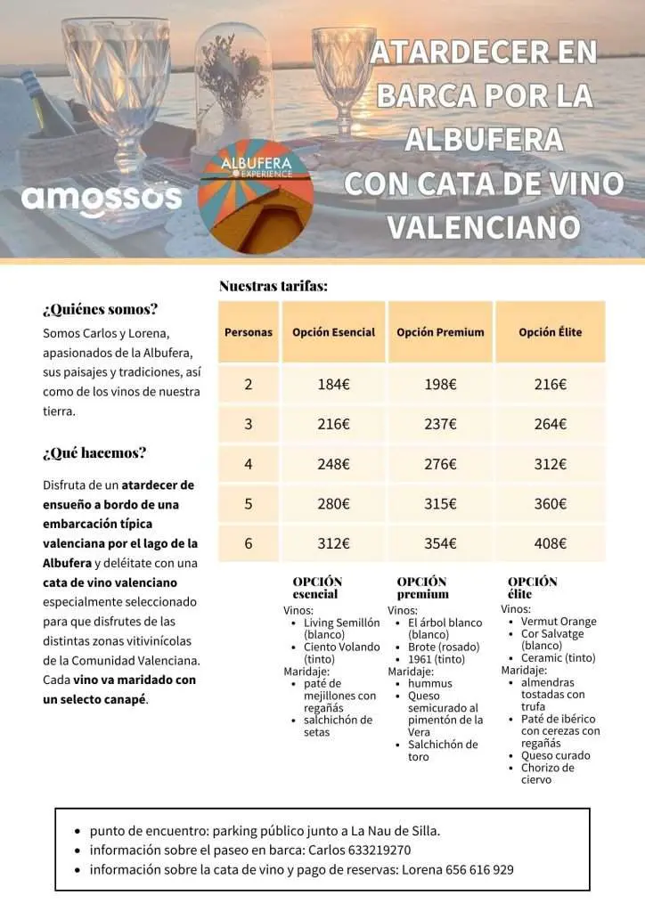 - Incluye: Paseo en barca, información didáctica sobre el parque, cata de tres vinos valencianos y maridaje gourmet.