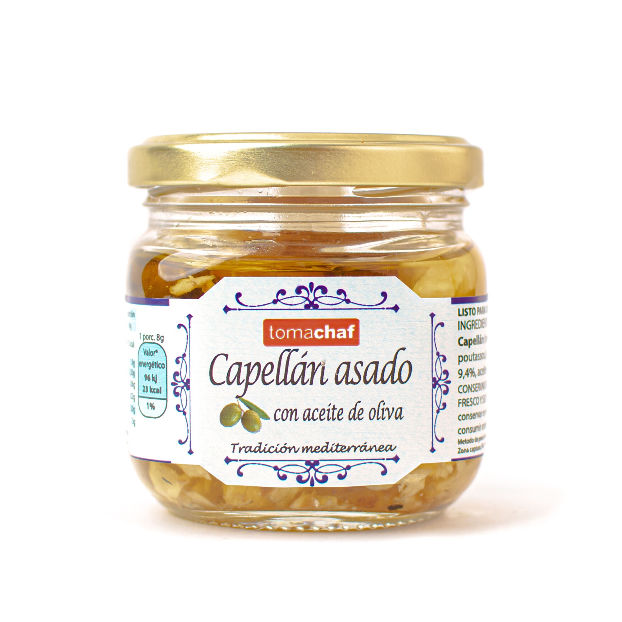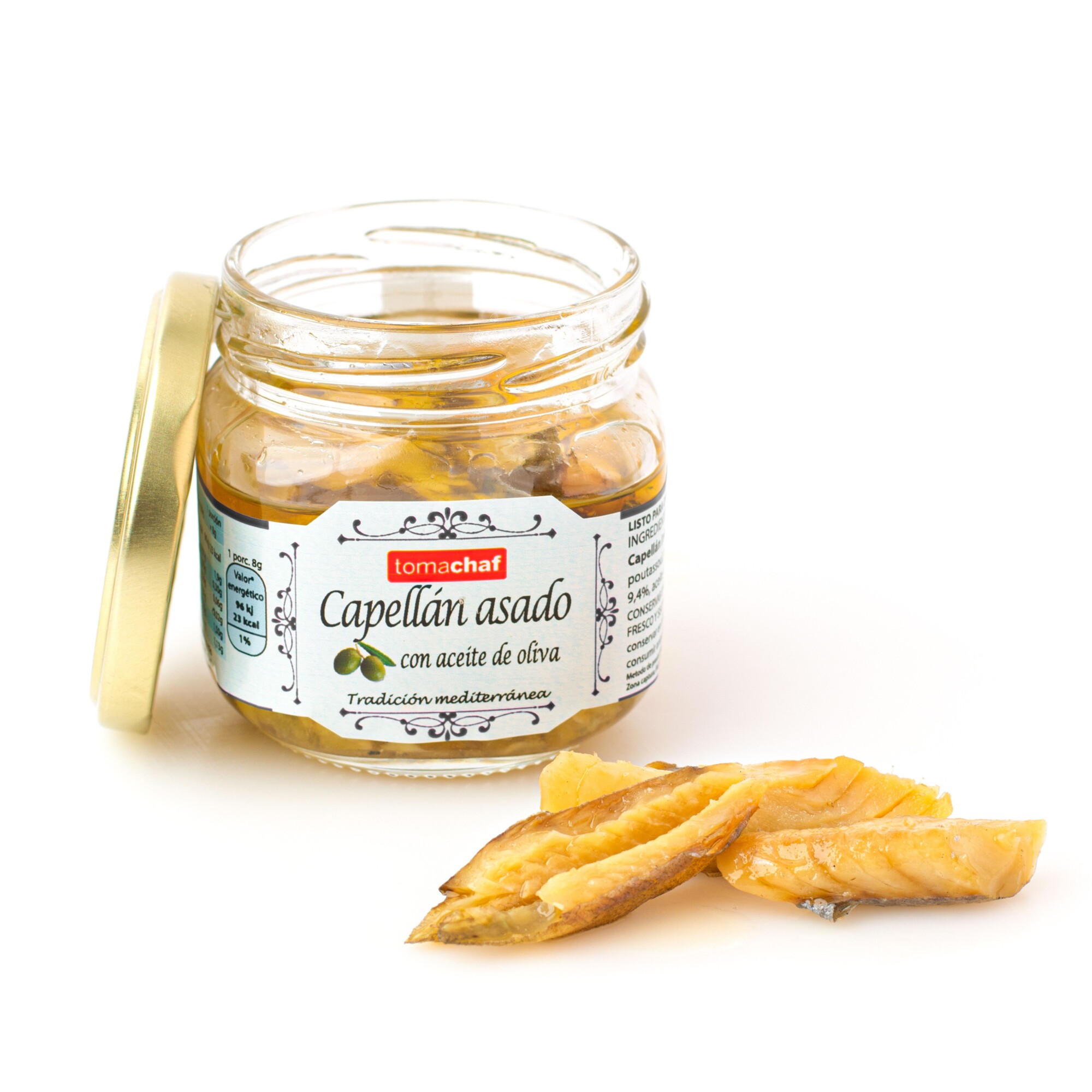 El Capellán asado Tomachaf es un producto tradicional del Mediterráneo español elaborado con capellán (también conocido como bacaladilla o faneca menor), aceite de oliva, aceite de girasol y sal. El capellán es un pescado salado y seco con sabor intenso que se valora por su textura firme y carácter marinero.