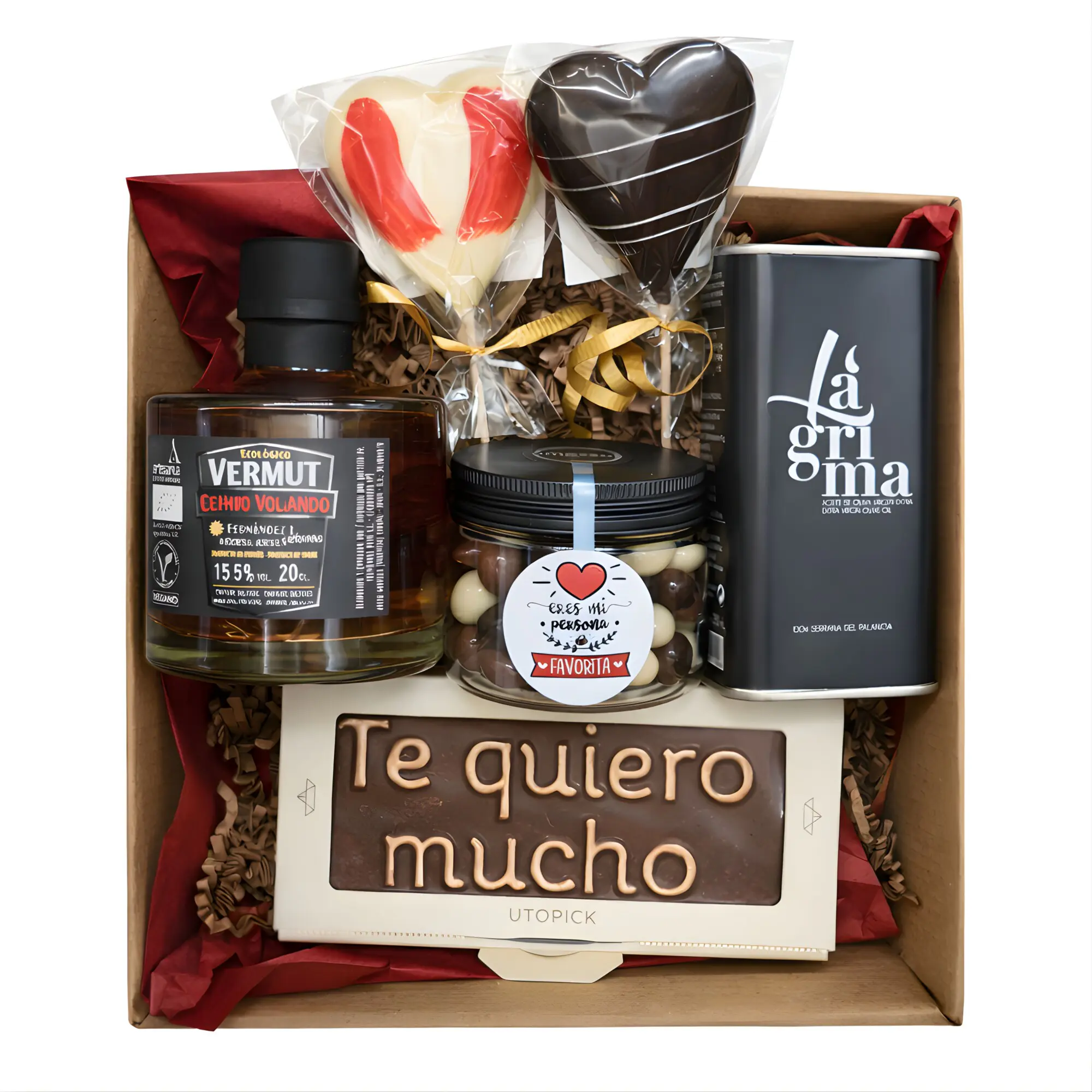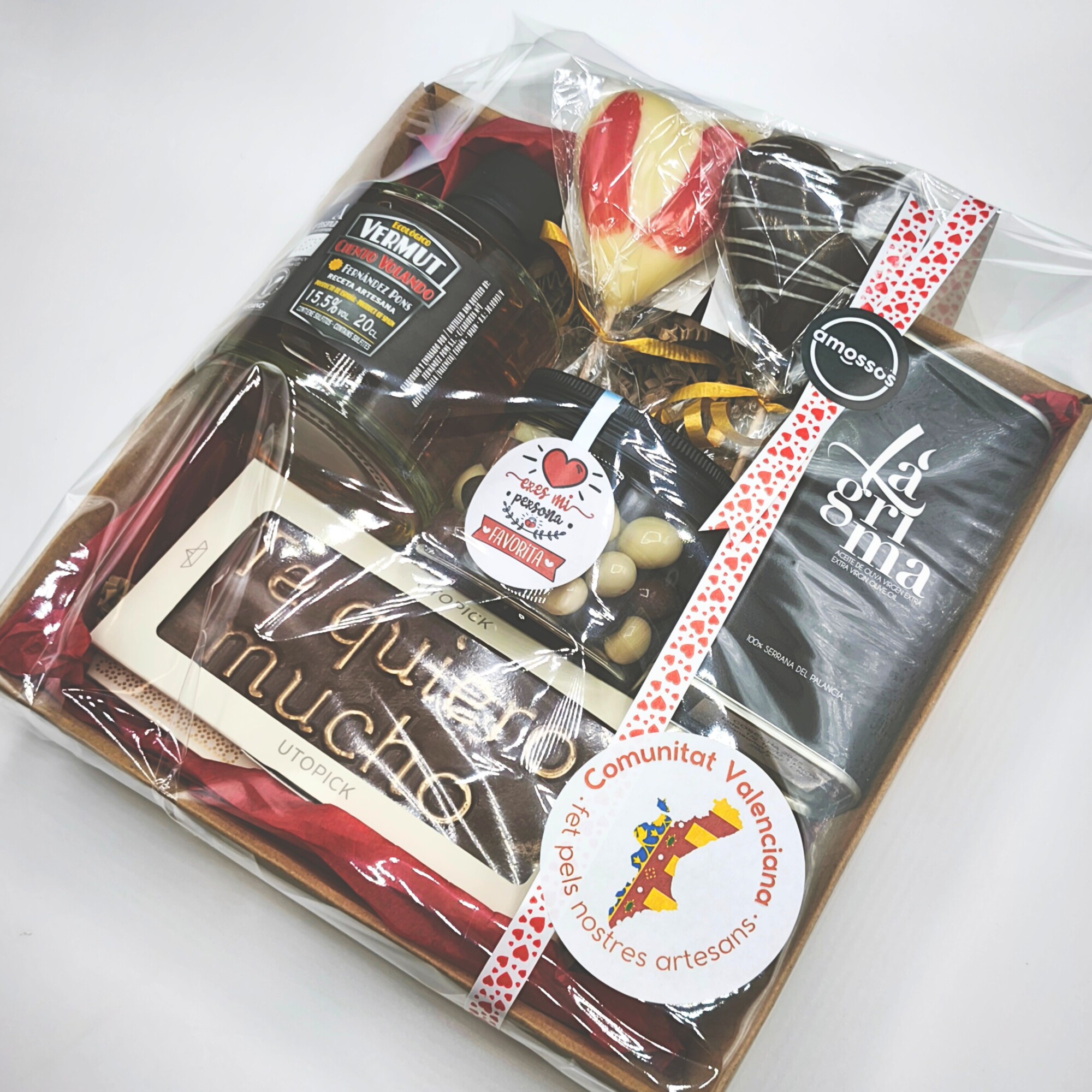 En su interior encontrarás chocolate artesano con mensaje de Utopick, cacahuetes a los tres chocolates de Rafael Andreu (que además llevan el mensaje "Eres mi persona favorita"), piruletas corazón en formato blanco y negro para compartir, aceite de oliva virgen extra de primera extracción en frío de la Cooperativa de Viver, y una botella mini de vermut blanco de Fernández Pons para brindar sin excusas.