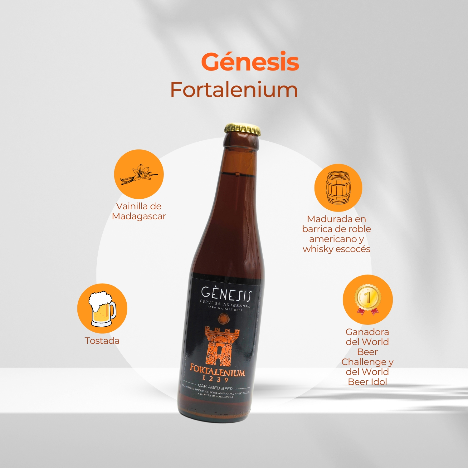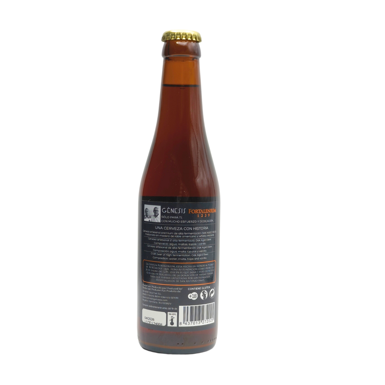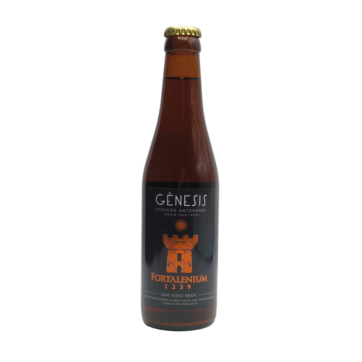 Descubre la premiada Genesis Fortalenium 1239, una exclusiva Oak Aged Whisky Beer valenciana, envejecida 12 meses en barricas de roble americano y whisky escocés. Sumérgete en sus intensas notas de roble ahumado, vainilla Bourbon y caramelo. ¡Una experiencia de trago lento para paladares exigentes!