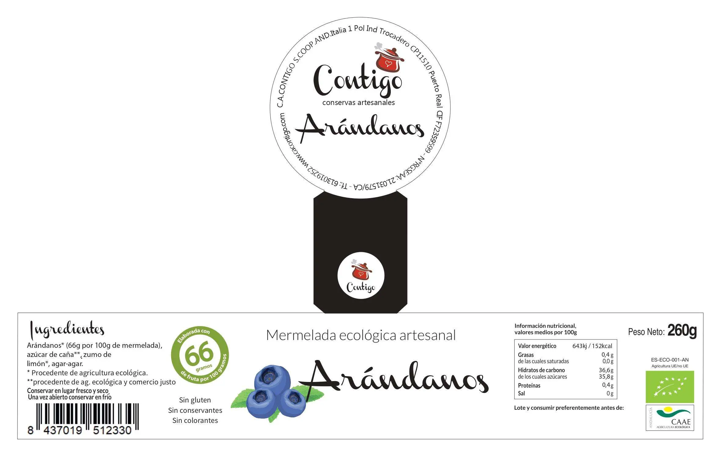 Ingredientes: Arándanos ecológicos, azúcar semiblanco de caña ecológico y de comercio justo, zumo de limón ecológico, agar-agar.