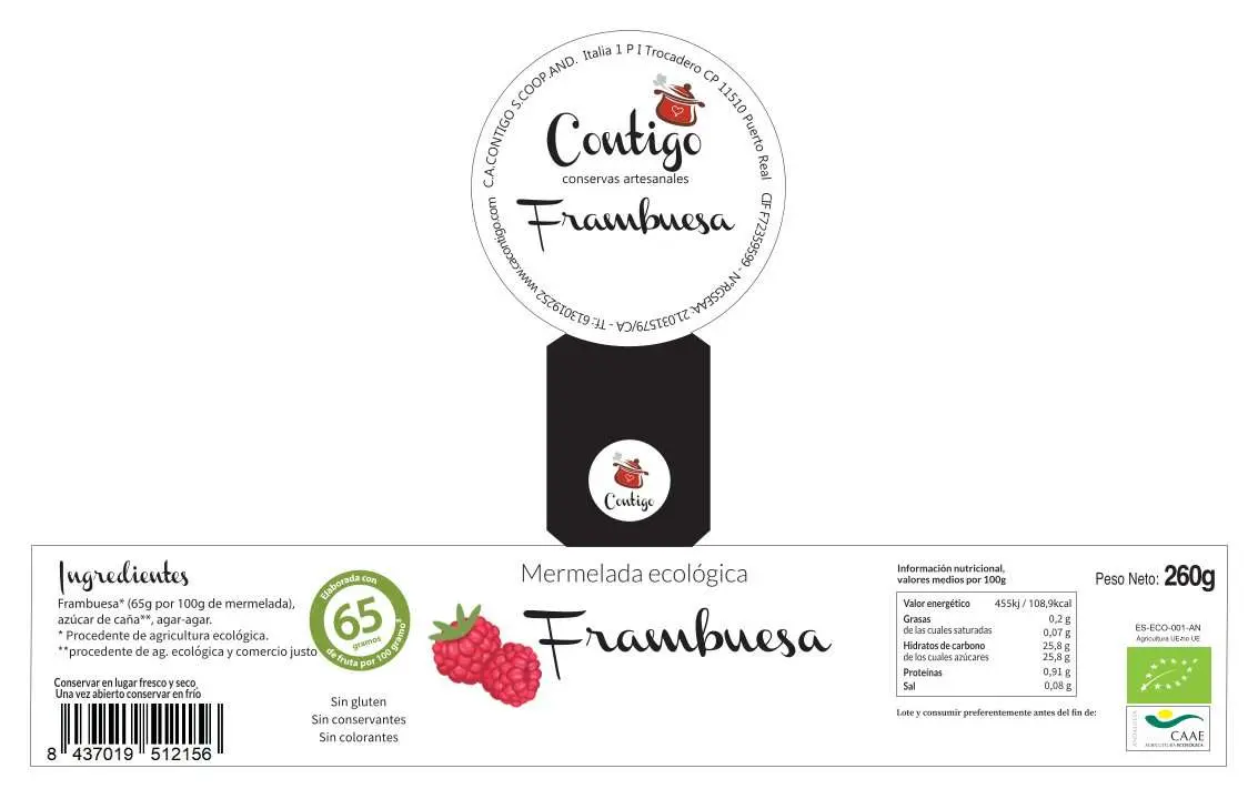 Ingredientes: Frambuesas ecológicas, azúcar semiblanco de caña procedente de comercio justo y agricultura ecológica, zumo de limón, agar-agar.