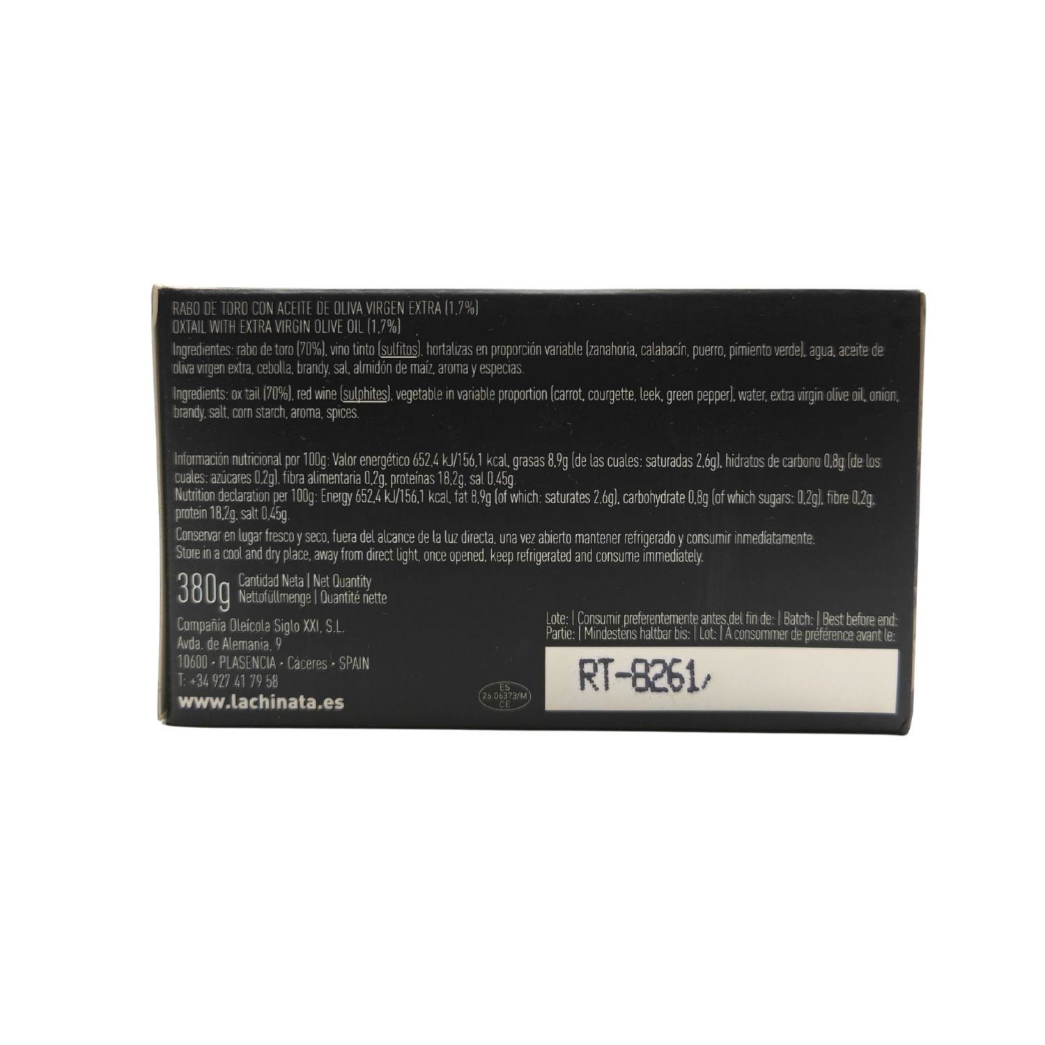 Rabo de toro (70%), vino tinto (sulfitos), hortalizas en proporción variable (zanahoria, calabacín, puerro, pimiento verde), agua, aceite de oliva virgen extra, cebolla, brandy, sal, almidón de maíz, aroma, especias.