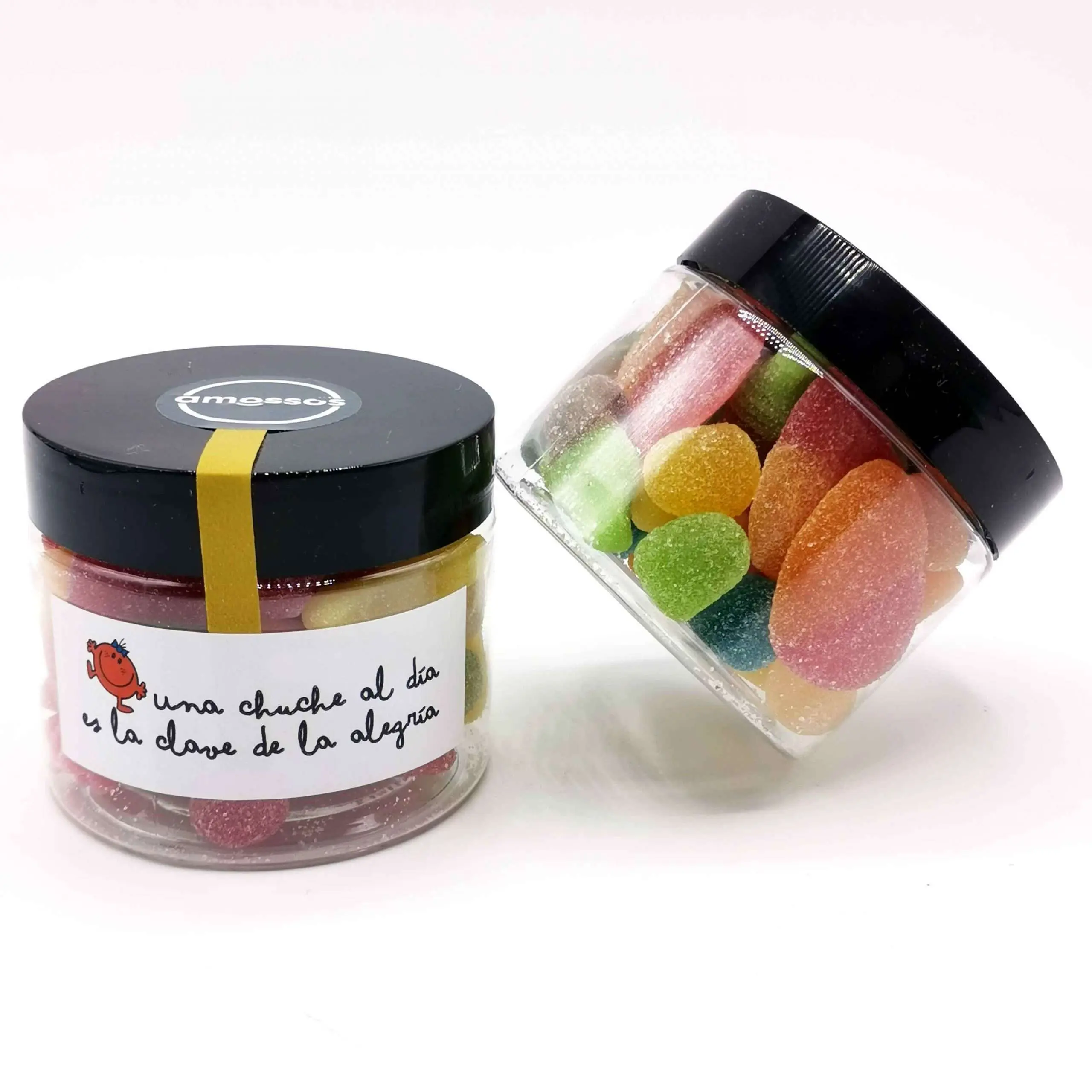 Deliciosas golosinas surtidas cubiertas de azúcar y presentadas en un bote transparente y casi irrompible de plástico de primera calidad y adecuado al uso alimentario, perfecto para los peques más traviesos a los que les encantan las chuches.