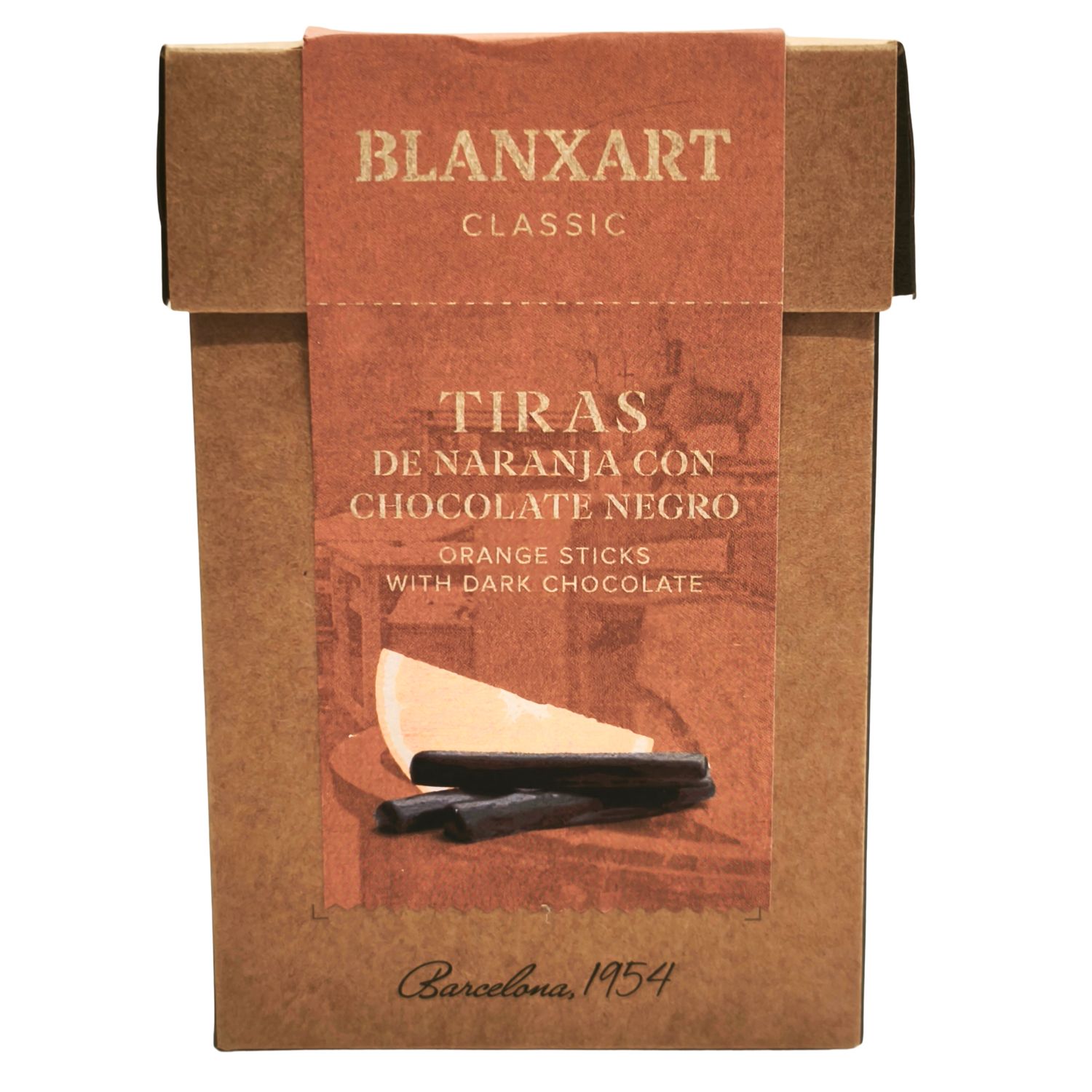 Tiras de naranja confitadas lentamente y recubiertas con una capa de chocolate negro intenso. de Blanxart. Un contraste equilibrado entre dulzor y amargor que convierte este clásico en un imprescindible de la repostería gourmet.