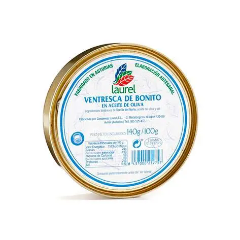 Conservas Laurel nos presenta esta ventresca de bonito del norte seleccionada y conservada en aceite de oliva dentro de un envase lacado en su interior para que mantenga todas sus propiedades y cualidades nutritivas.