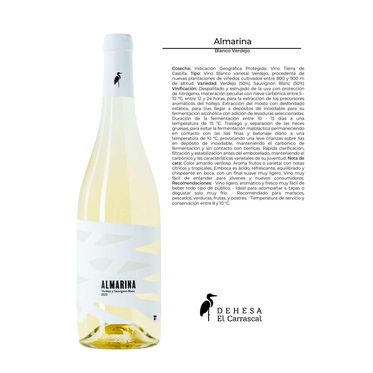 El vino blanco Almarina de Dehesa El Carrascal con indicación geográfica protegida Tierra de Castilla está elaborado con 50% Verdejo y 50% Sauvignon Blanc de viñedos situados entre 800 y 900 m de altitud.