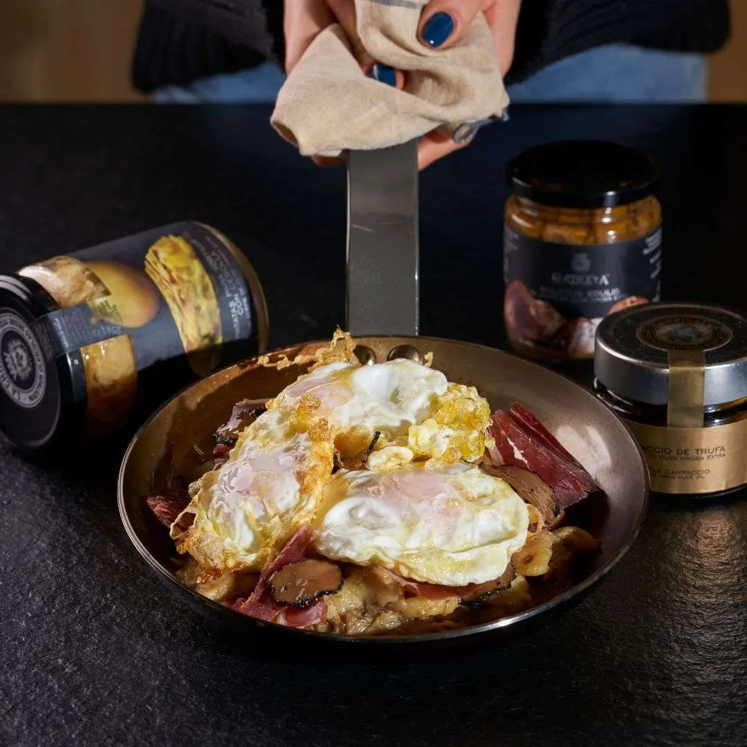 Estos Huevos Rotos con salsa de Boletus Eduli, y Jamón Ibérico son una muestra de lo mejor de nuestra gastronomía: sencillos, accesibles y absolutamente deliciosos. Su base de patatas y huevos los hace ideales para cualquier ocasión, desde una comida informal hasta un encuentro especial.